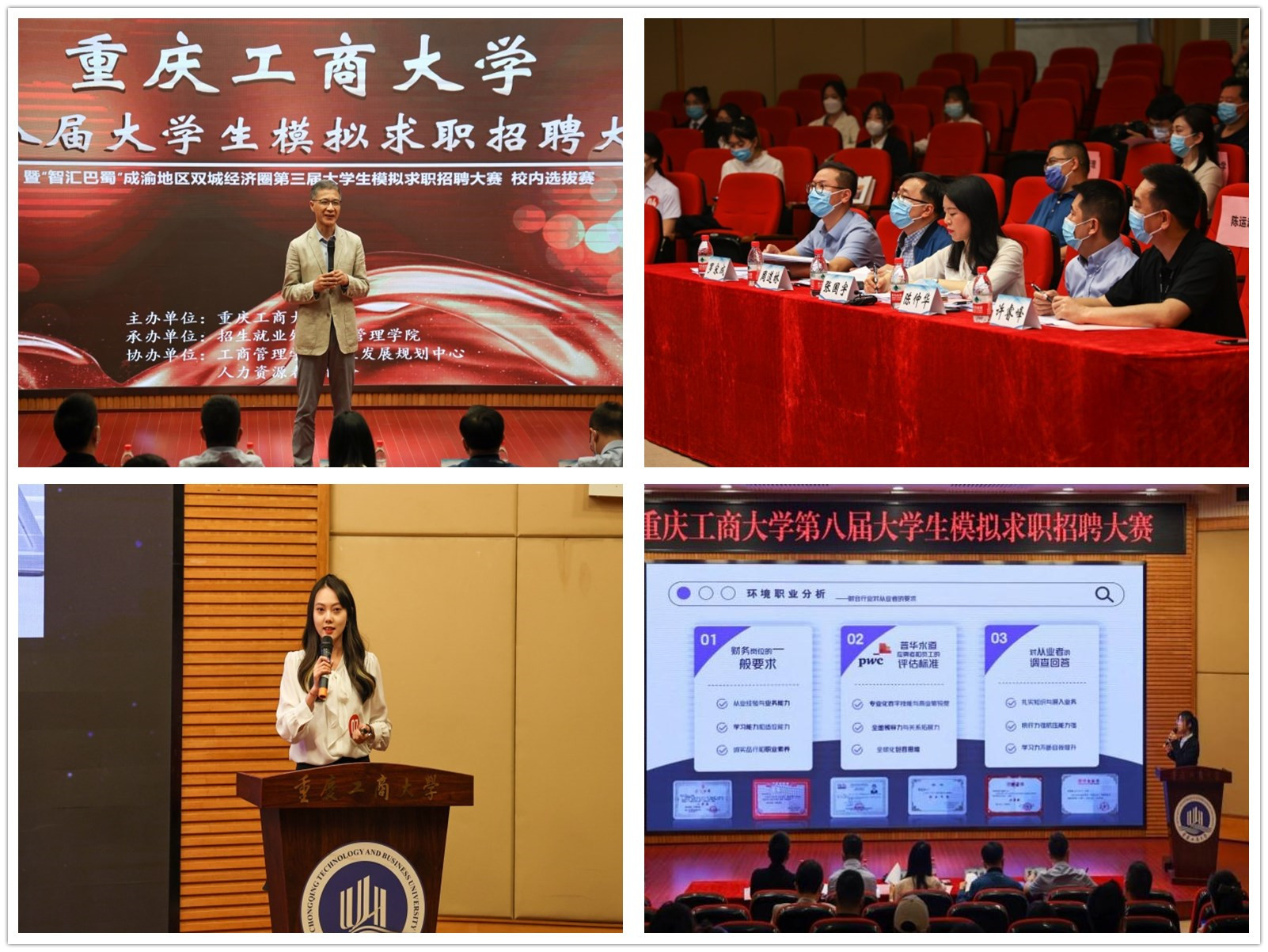 4月28日,由新葡的京集团8814登录入口招生就业处主办,工商管理学院承办的新葡的京集团8814登录入口第八届大学生模拟求职招聘大赛暨“智汇巴蜀”成渝双城经济圈第三届大学生模拟求职招聘大赛重庆赛区校内选拔赛在博智楼7200报告厅成功举办。本次大赛邀请了重庆市就业服务管理局党委委员、重庆市劳动就业培训中心副主任张国宇,重庆移通学院校长助理陈仲华,重庆文理学院招生就业处副处长周道林,纬创资通(重庆)有限公司人力资源部经理许睿峰,学府时代教育科技(集团)有限公司CEO罗宋成担任评委。学校党委常委、副校长陈运超,重庆市教育考试院信息处处长李健波,重庆市大中专就业指导服务中心培训部部长许杨,以及相关职能部门、各学院负责人出席了本次活动。