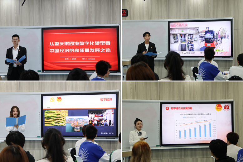 在宣讲环节,经济学院宣讲团成员、“青马工程”大学生骨干培训班成员张维达同学从重庆果园港的数字化转型出发,探讨了中国经济的高质量发展之路;谢林涛同学分析了数字经济在公共服务领域的赋能作用;康欣同学以《数字经济新引擎,赋能国际经贸新未来》为题,分享了数字经济在国际经贸领域的广阔前景;余林妍同学则围绕《新时代的经济引擎:数字经济》,全面阐述了数字经济在新时代的重要地位和作用。