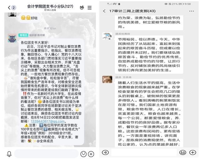 活动中,同学们围绕“拒绝舌尖上的浪费”的主题展开了积极的讨论。2017级丁俊程说到:“以“光盘”为荣,以“剩饭”为耻,坚持“餐餐不余、年年有余”,争做爱粮节粮的践行者。”2017级杜燕玲讲到:“节用裕民、俭以养德。我们要继续弘扬艰苦奋斗、勤俭节约的优良传统,自觉养成勤俭节约的习惯。”2018级林婉滨谈到自己的感想:“这一切时刻在提醒我们杜绝浪费,从我做起。餐餐光盘、科学点餐、拒绝铺张、健康饮食、记得打包、坚守‘粮’心。”每一段文字都体现会计学子作为新一代青年居安思危的意识,自觉做到反对餐饮浪费,践行勤俭节约的良好习惯。